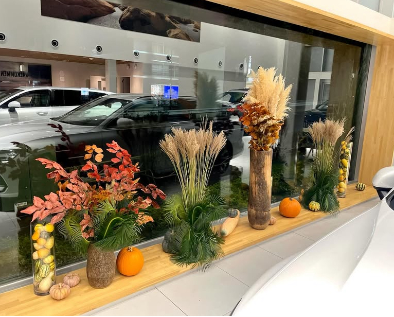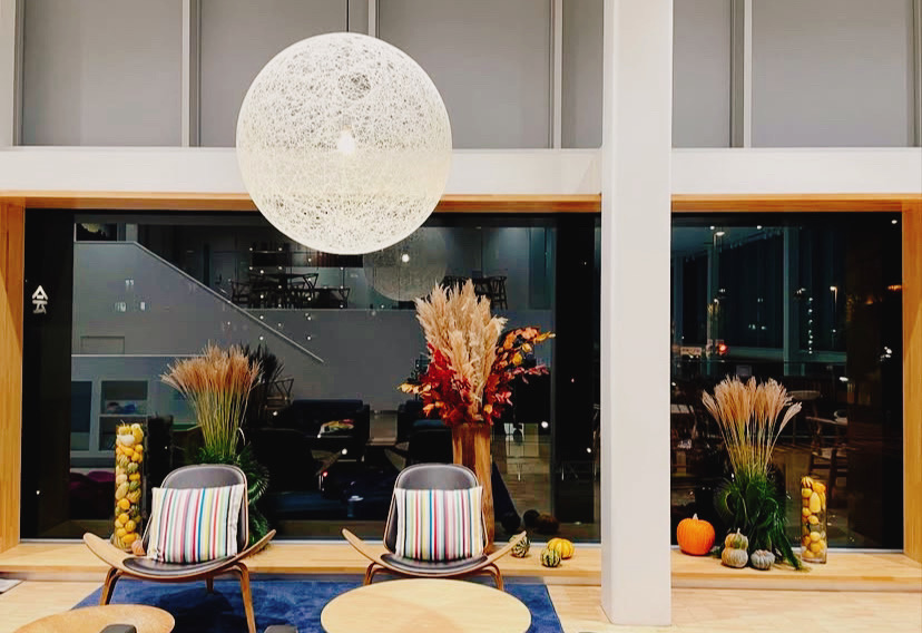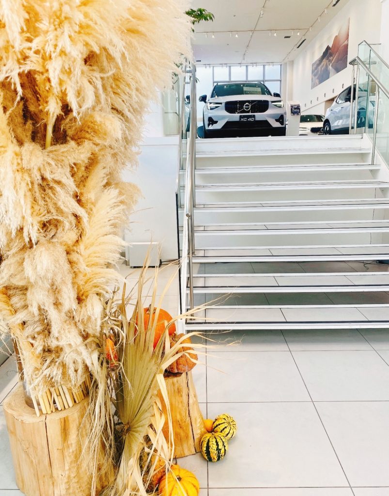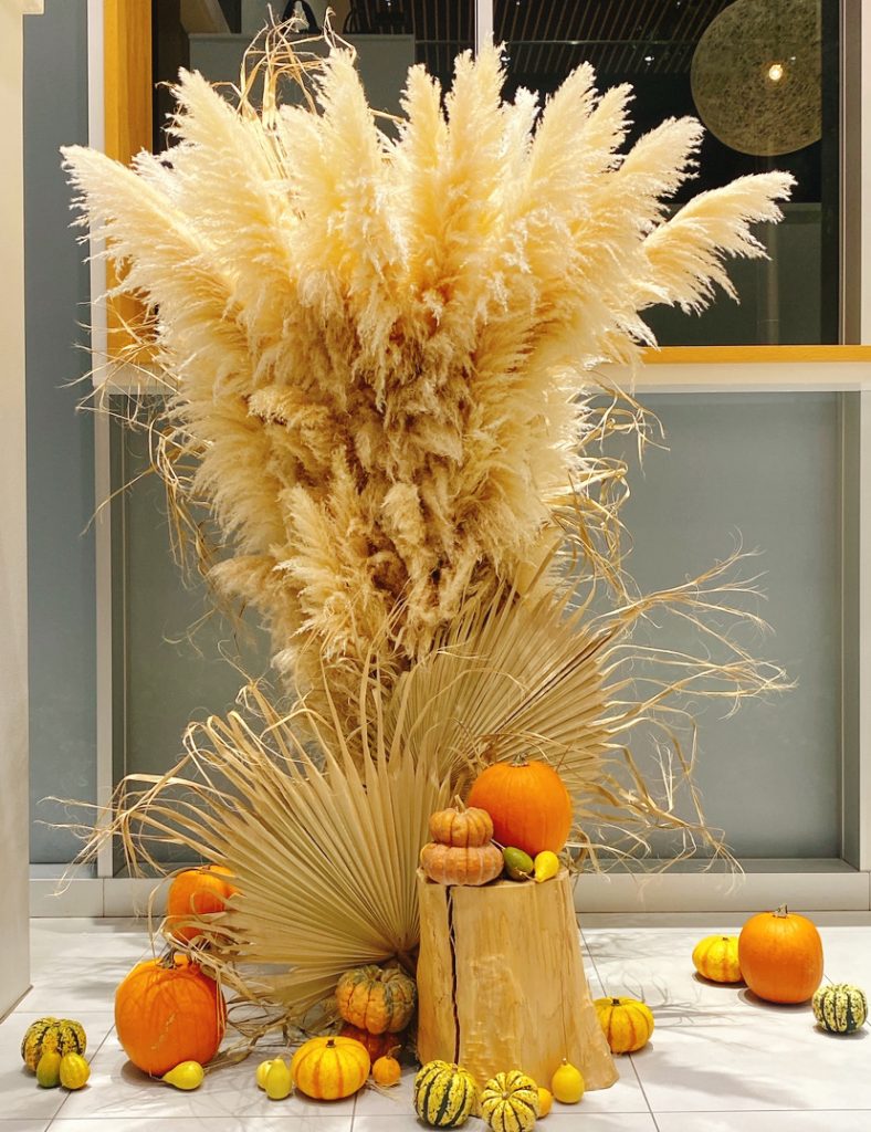 1F・2Fのディスプレイは カボチャを花器に入れ直立させ、 パンパスとススキの縦のラインを強調して力強く男性的なモダンスタイルに仕上げました。 そこにザミアを巻いてススキの足元に敷きハロウィンらしい少し不気味な要素を表現しています。