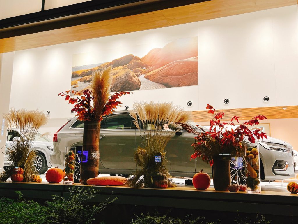 1F・2Fのディスプレイは カボチャを花器に入れ直立させ、